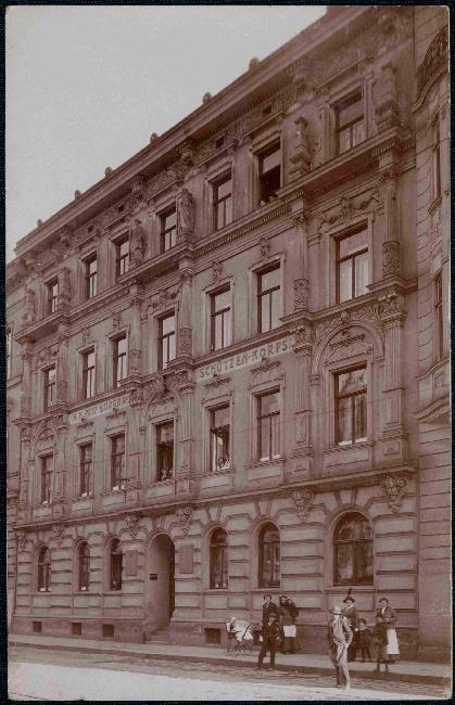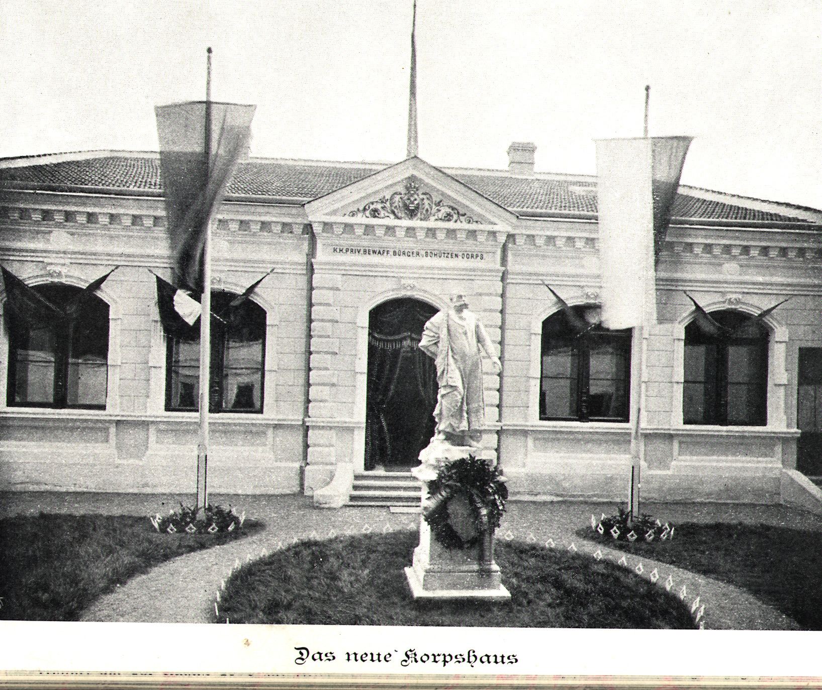 Na historické fotografii (obr. č. 1) průčelí domu vidíme po stranách vchodu dvě tabule, zřejmě oznamující, že v domě sídlí mimo brněnských ostrostřelců i Ústředí ostrostřeleckých sborů Rakouska - Uherska. Město Brno mělo v záležitosti ostrostřeleckých sborů v monarchii své výsadní postavení a tamní sbor se těšil od roku 1866 titulem "Císařsko - královský privilegovaný" ozbrojený měšťanský a střelecký sbor.